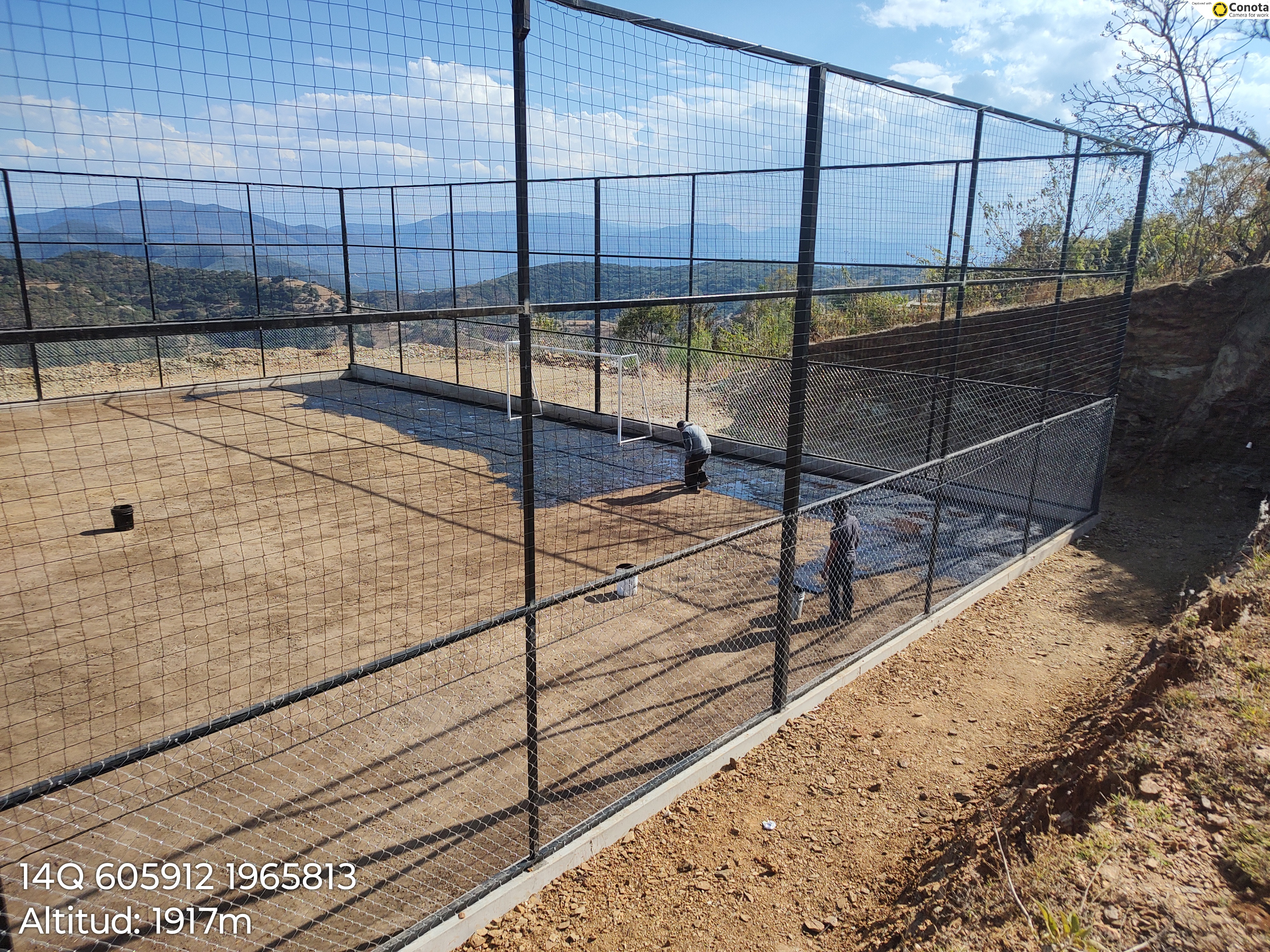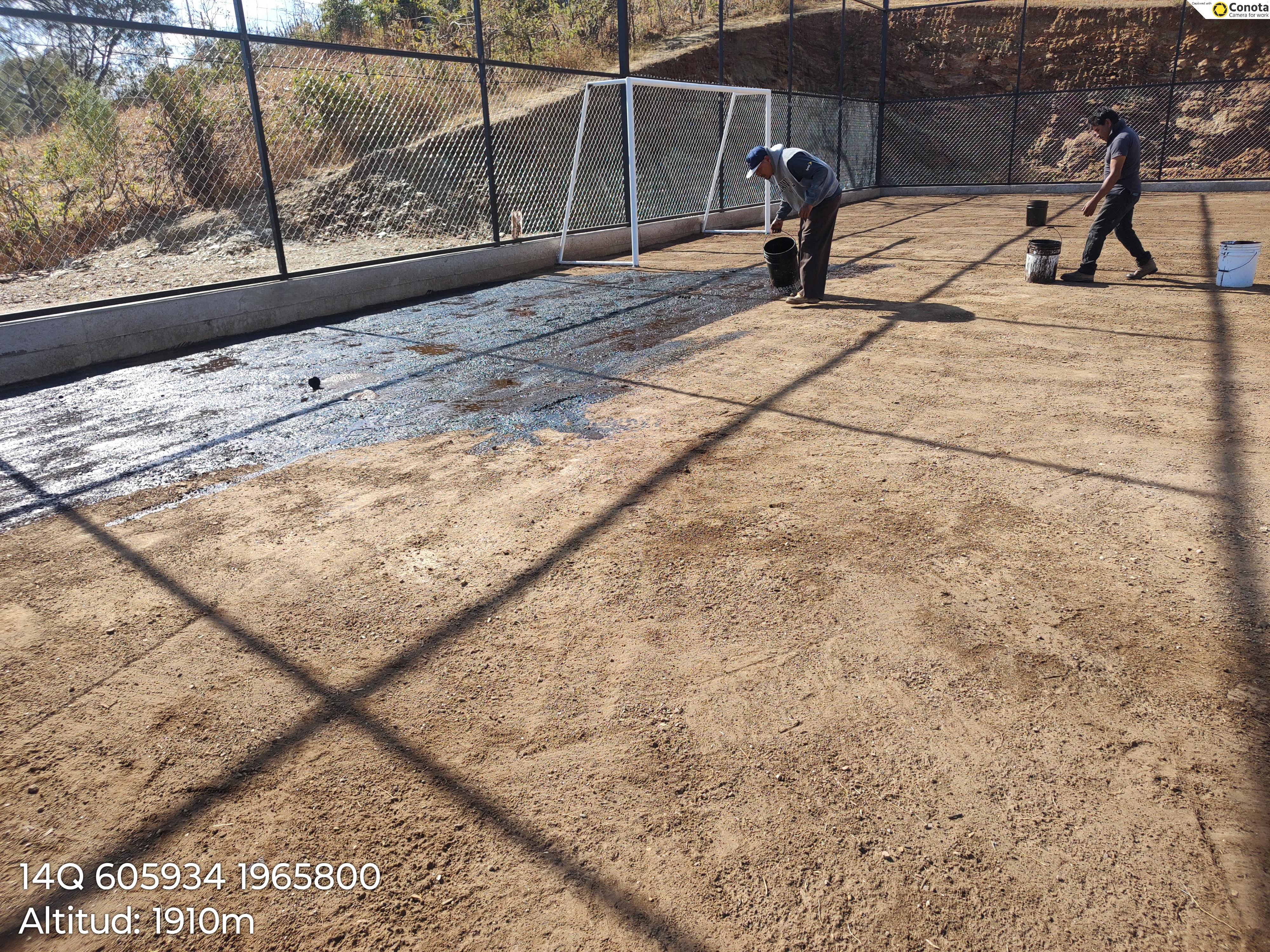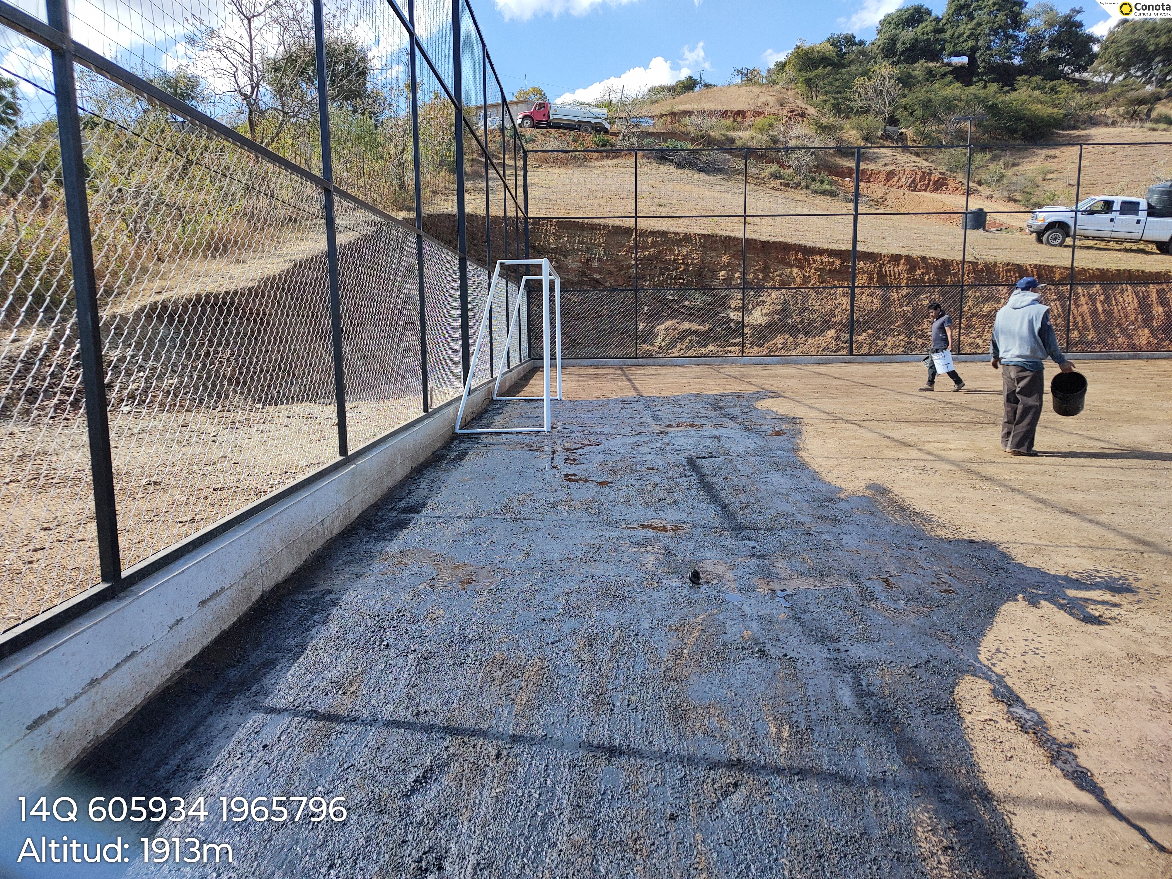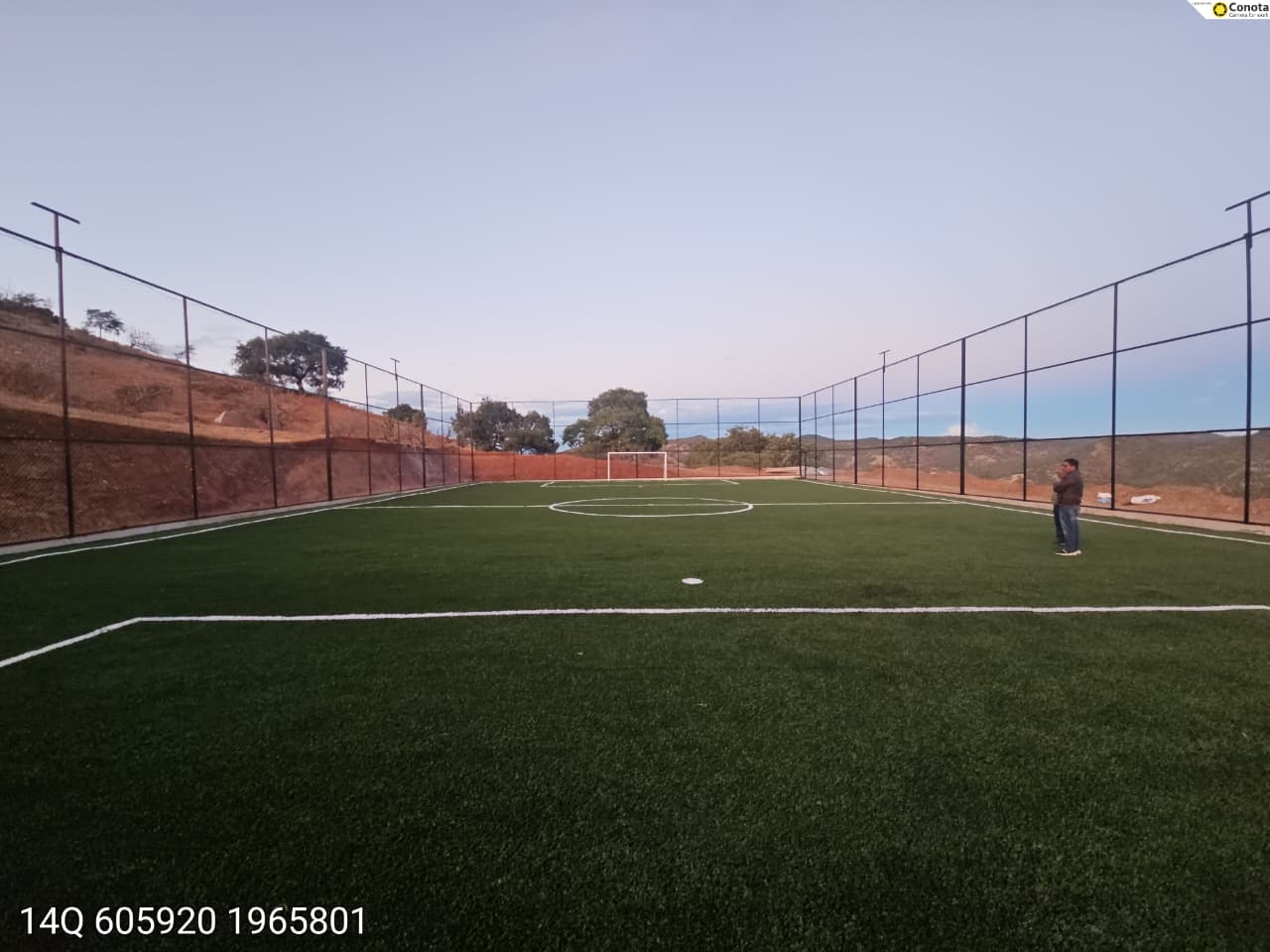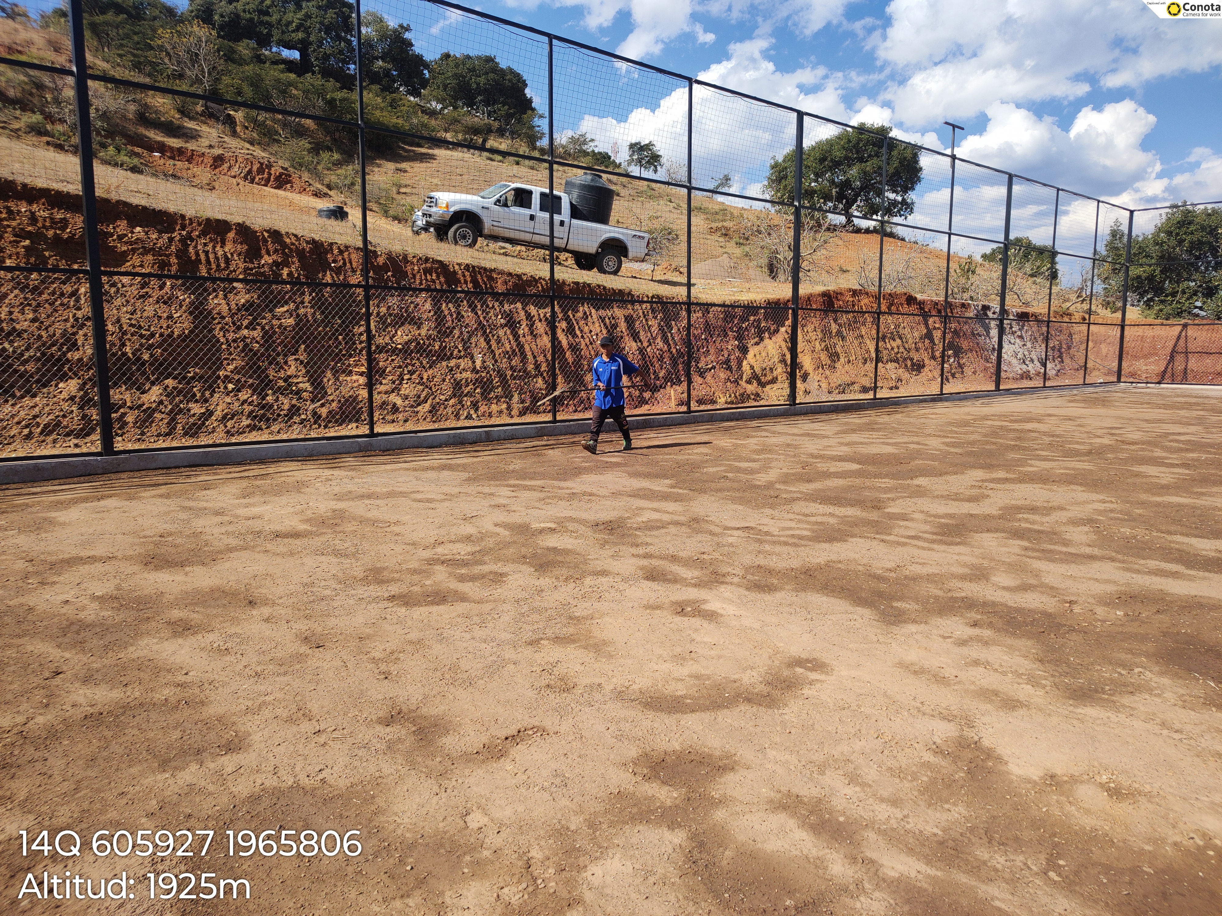 TRAZO Y NIVELACIÓN DE 1,426 M2 PARA ESTABLECER EJES, BANCO DE NIVEL Y REFERENCIAS DE PLATAFORMA; CORTE DE 684.11 M3 DE TERRENO CON MAQUINARIA Y FORMACIÓN DE 611.65 M3 DE TERRAPLÉN CON MATERIAL PRODUCTO DEL CORTE, COMPACTADO CON MAQUINARIA; CONSTRUCCIÓN DE 40 DADOS DE CONCRETO ARMADO PARA CIMENTACIÓN DE ESTRUCTURA METÁLICA Y CONSTRUCCIÓN DE 128.80 ML DE CADENA DE FRONTERA, A BASE DE CONCRETO DE F'C= 250 KG/CM2 Y ACERO DEL #3 Y EST DEL #2; SUMINISTRO Y COLOCACIÓN DE CERCO DE HERRERÍA PARA DELIMITACIÓN DE CANCHA DE FUTBOL, A BASE DE PERFILES PTR DE 4"X4" Y 2"X 2"; SUMINISTRO E INSTALACIÓN DE PUERTA DE MALLA CICLÓNICA DE 0.90 M DE ANCHO POR 2.00M DE ALTURA; SUMINISTRO Y COLOCACIÓN DE 128 ML DE MALLA CICLÓNICA DE 2.00 M. DE ALTURA; SUMINISTRO Y COLOCACIÓN DE 2 PORTERÍAS METÁLICA A BASE DE TUBO CED 30 DE 2" Y 3"; SUMINISTRO Y COLOCACIÓN DE 384 M2 DE RED PERIMETRAL DE 3 PULGADAS DE NYLON ALQUITRANADA; Y SUMINISTRO E INSTALACIÓN DE 960 M2 DE PASTO SINTÉTICO TERZA. INCLUYE MANO DE OBRA EN INSTALACIÓN DE PASTO, ARENA SÍLICA, CAUCHO GRANULADO.