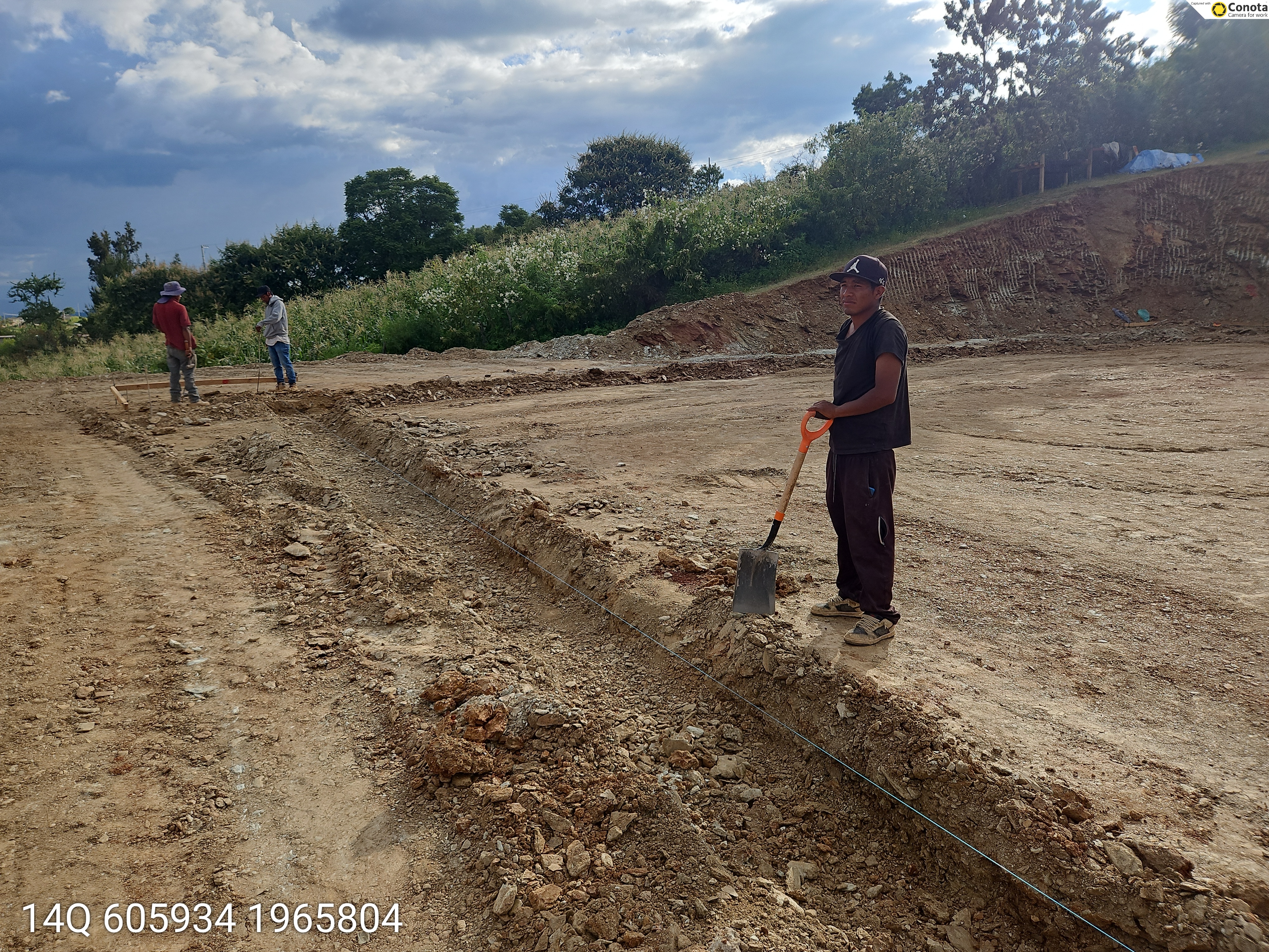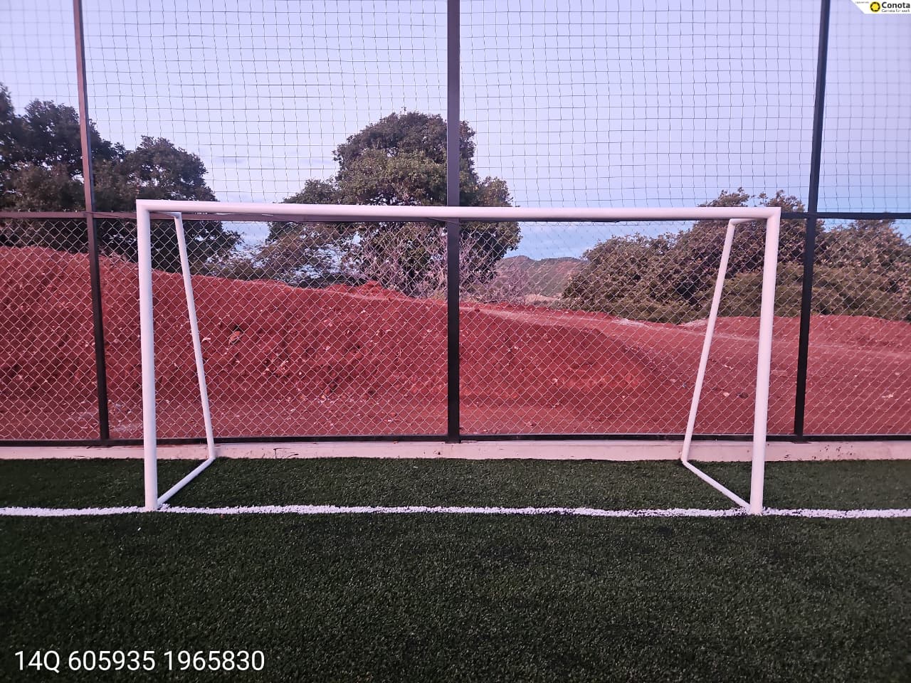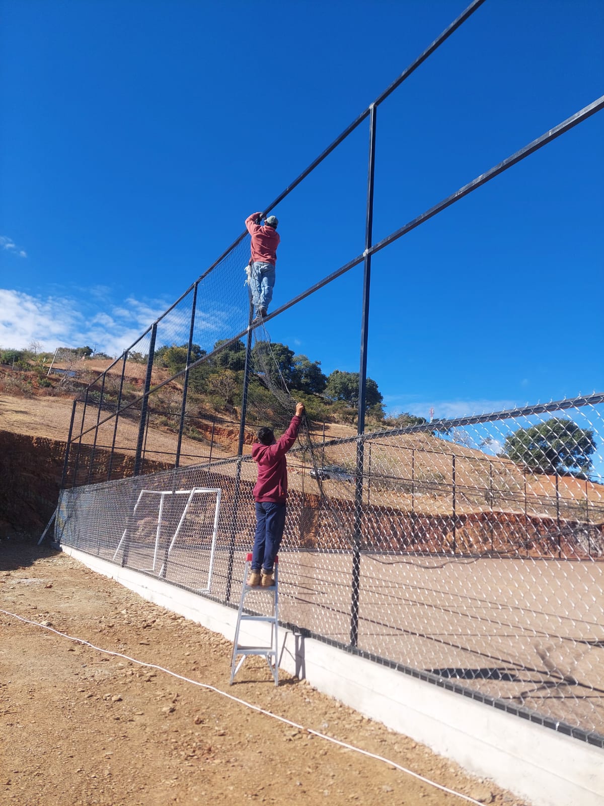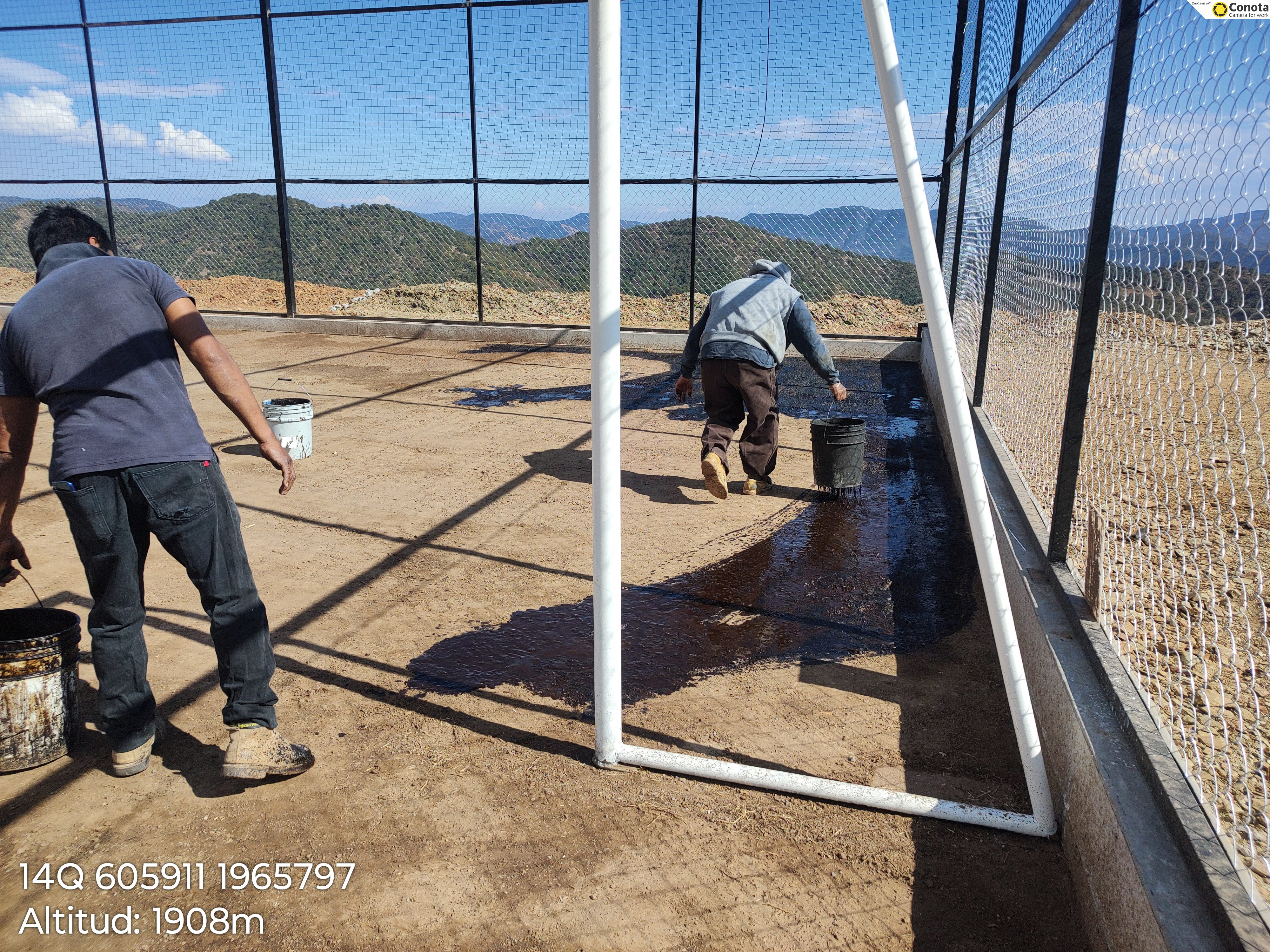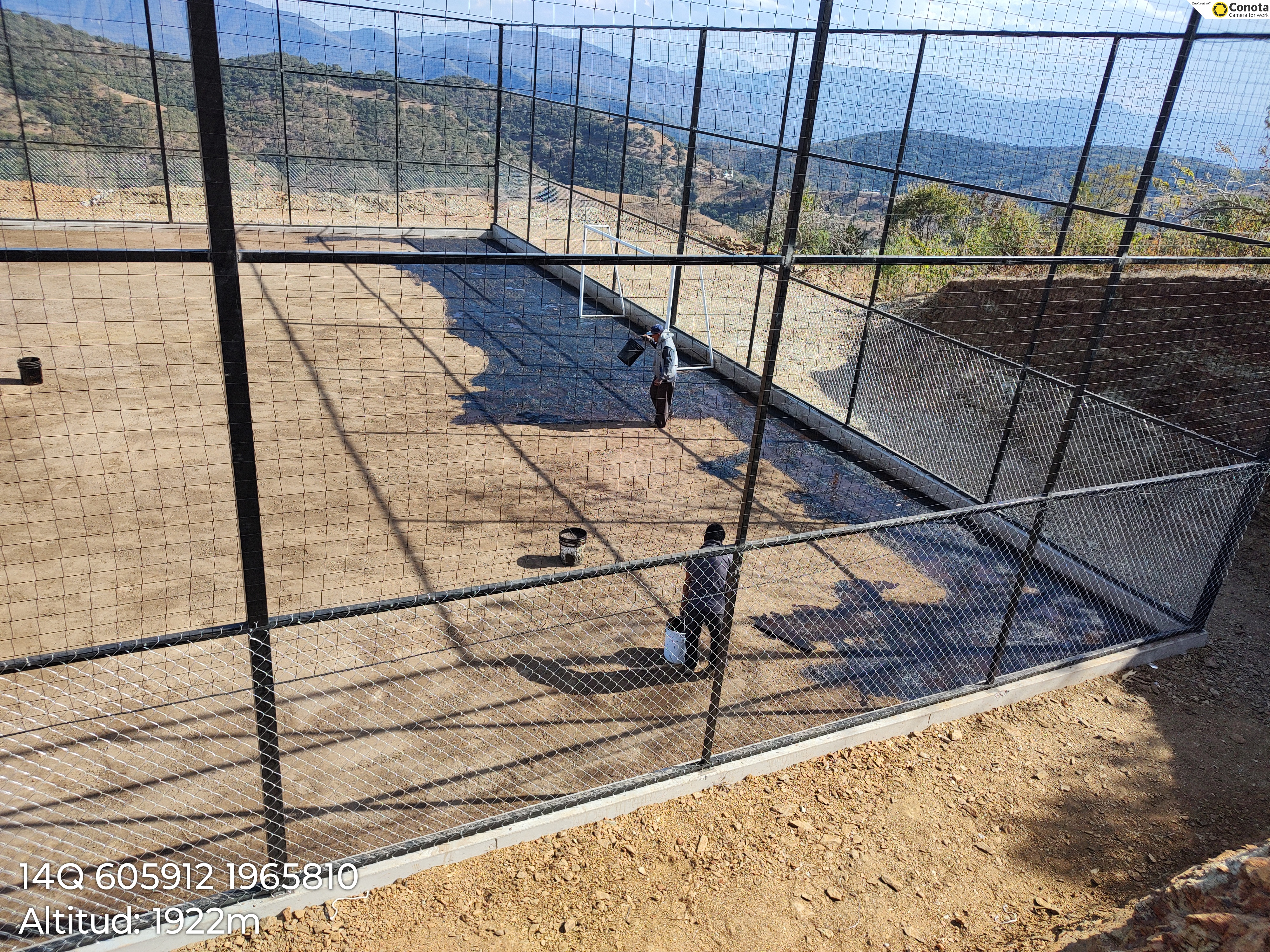 TRAZO Y NIVELACIÓN DE 1,426 M2 PARA ESTABLECER EJES, BANCO DE NIVEL Y REFERENCIAS DE PLATAFORMA; CORTE DE 684.11 M3 DE TERRENO CON MAQUINARIA Y FORMACIÓN DE 611.65 M3 DE TERRAPLÉN CON MATERIAL PRODUCTO DEL CORTE, COMPACTADO CON MAQUINARIA; CONSTRUCCIÓN DE 40 DADOS DE CONCRETO ARMADO PARA CIMENTACIÓN DE ESTRUCTURA METÁLICA Y CONSTRUCCIÓN DE 128.80 ML DE CADENA DE FRONTERA, A BASE DE CONCRETO DE F'C= 250 KG/CM2 Y ACERO DEL #3 Y EST DEL #2; SUMINISTRO Y COLOCACIÓN DE CERCO DE HERRERÍA PARA DELIMITACIÓN DE CANCHA DE FUTBOL, A BASE DE PERFILES PTR DE 4"X4" Y 2"X 2"; SUMINISTRO E INSTALACIÓN DE PUERTA DE MALLA CICLÓNICA DE 0.90 M DE ANCHO POR 2.00M DE ALTURA; SUMINISTRO Y COLOCACIÓN DE 128 ML DE MALLA CICLÓNICA DE 2.00 M. DE ALTURA; SUMINISTRO Y COLOCACIÓN DE 2 PORTERÍAS METÁLICA A BASE DE TUBO CED 30 DE 2" Y 3"; SUMINISTRO Y COLOCACIÓN DE 384 M2 DE RED PERIMETRAL DE 3 PULGADAS DE NYLON ALQUITRANADA; Y SUMINISTRO E INSTALACIÓN DE 960 M2 DE PASTO SINTÉTICO TERZA. INCLUYE MANO DE OBRA EN INSTALACIÓN DE PASTO, ARENA SÍLICA, CAUCHO GRANULADO.