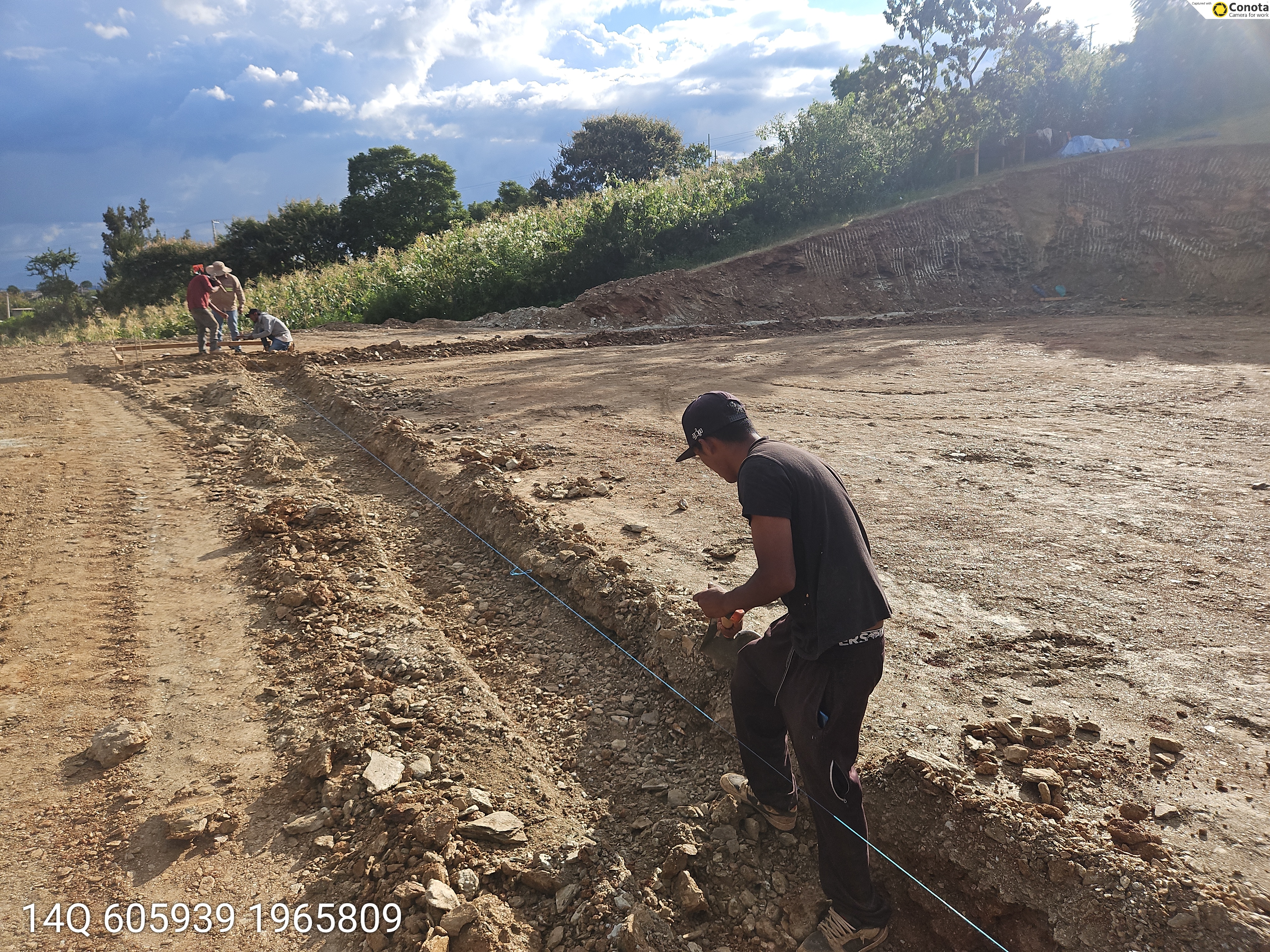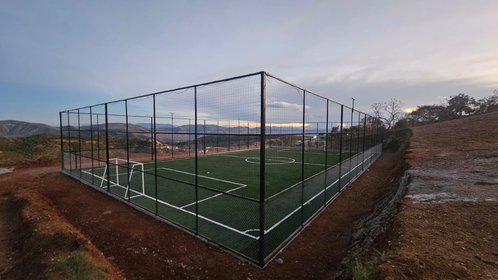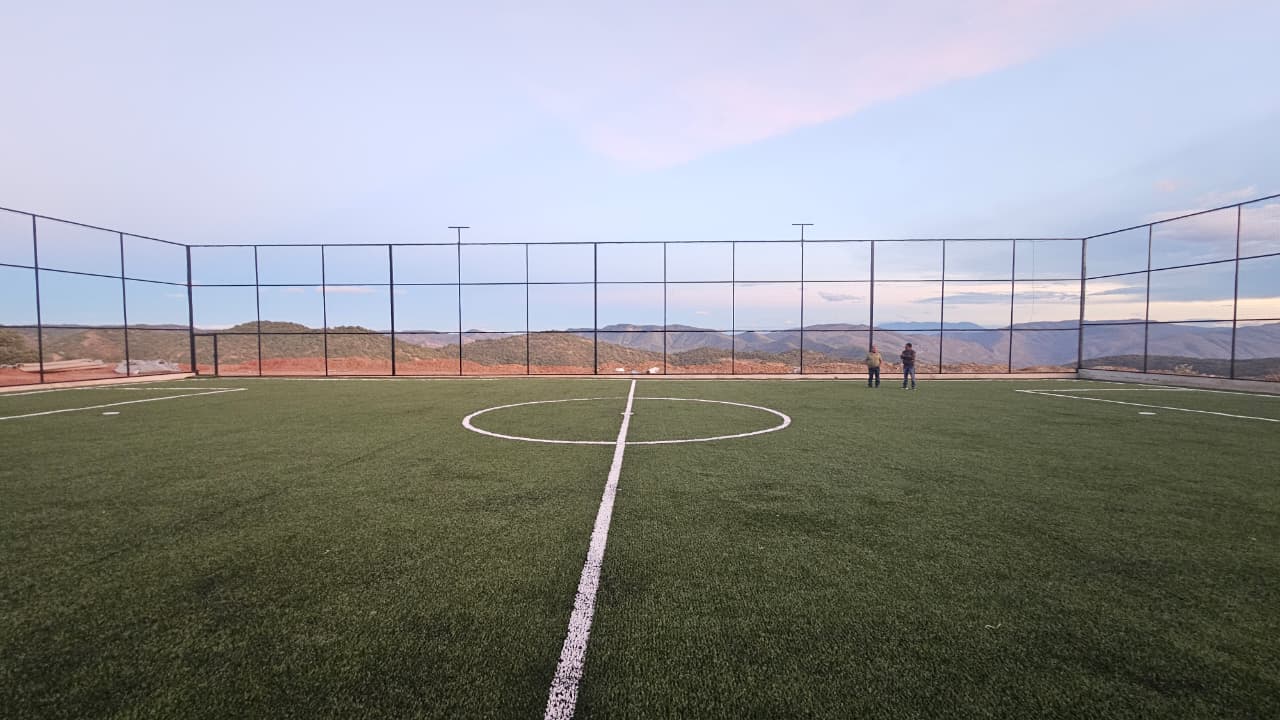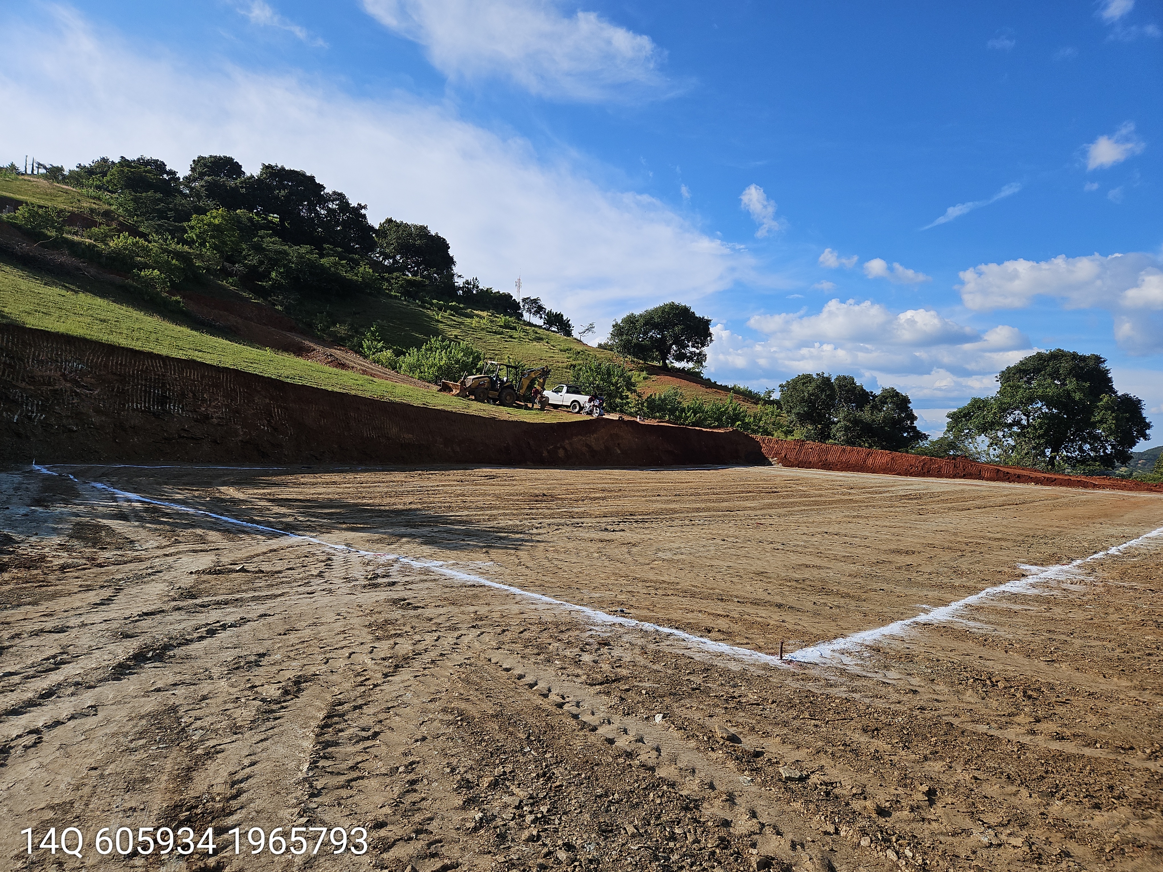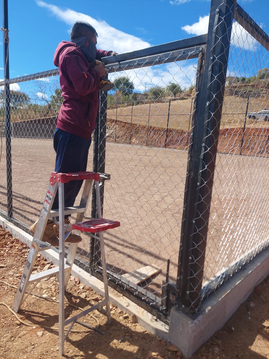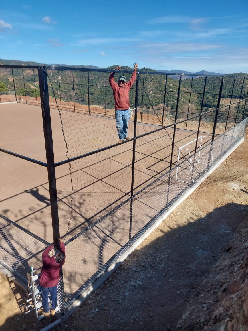TRAZO Y NIVELACIÓN DE 1,426 M2 PARA ESTABLECER EJES, BANCO DE NIVEL Y REFERENCIAS DE PLATAFORMA; CORTE DE 684.11 M3 DE TERRENO CON MAQUINARIA Y FORMACIÓN DE 611.65 M3 DE TERRAPLÉN CON MATERIAL PRODUCTO DEL CORTE, COMPACTADO CON MAQUINARIA; CONSTRUCCIÓN DE 40 DADOS DE CONCRETO ARMADO PARA CIMENTACIÓN DE ESTRUCTURA METÁLICA Y CONSTRUCCIÓN DE 128.80 ML DE CADENA DE FRONTERA, A BASE DE CONCRETO DE F'C= 250 KG/CM2 Y ACERO DEL #3 Y EST DEL #2; SUMINISTRO Y COLOCACIÓN DE CERCO DE HERRERÍA PARA DELIMITACIÓN DE CANCHA DE FUTBOL, A BASE DE PERFILES PTR DE 4"X4" Y 2"X 2"; SUMINISTRO E INSTALACIÓN DE PUERTA DE MALLA CICLÓNICA DE 0.90 M DE ANCHO POR 2.00M DE ALTURA; SUMINISTRO Y COLOCACIÓN DE 128 ML DE MALLA CICLÓNICA DE 2.00 M. DE ALTURA; SUMINISTRO Y COLOCACIÓN DE 2 PORTERÍAS METÁLICA A BASE DE TUBO CED 30 DE 2" Y 3"; SUMINISTRO Y COLOCACIÓN DE 384 M2 DE RED PERIMETRAL DE 3 PULGADAS DE NYLON ALQUITRANADA; Y SUMINISTRO E INSTALACIÓN DE 960 M2 DE PASTO SINTÉTICO TERZA. INCLUYE MANO DE OBRA EN INSTALACIÓN DE PASTO, ARENA SÍLICA, CAUCHO GRANULADO.