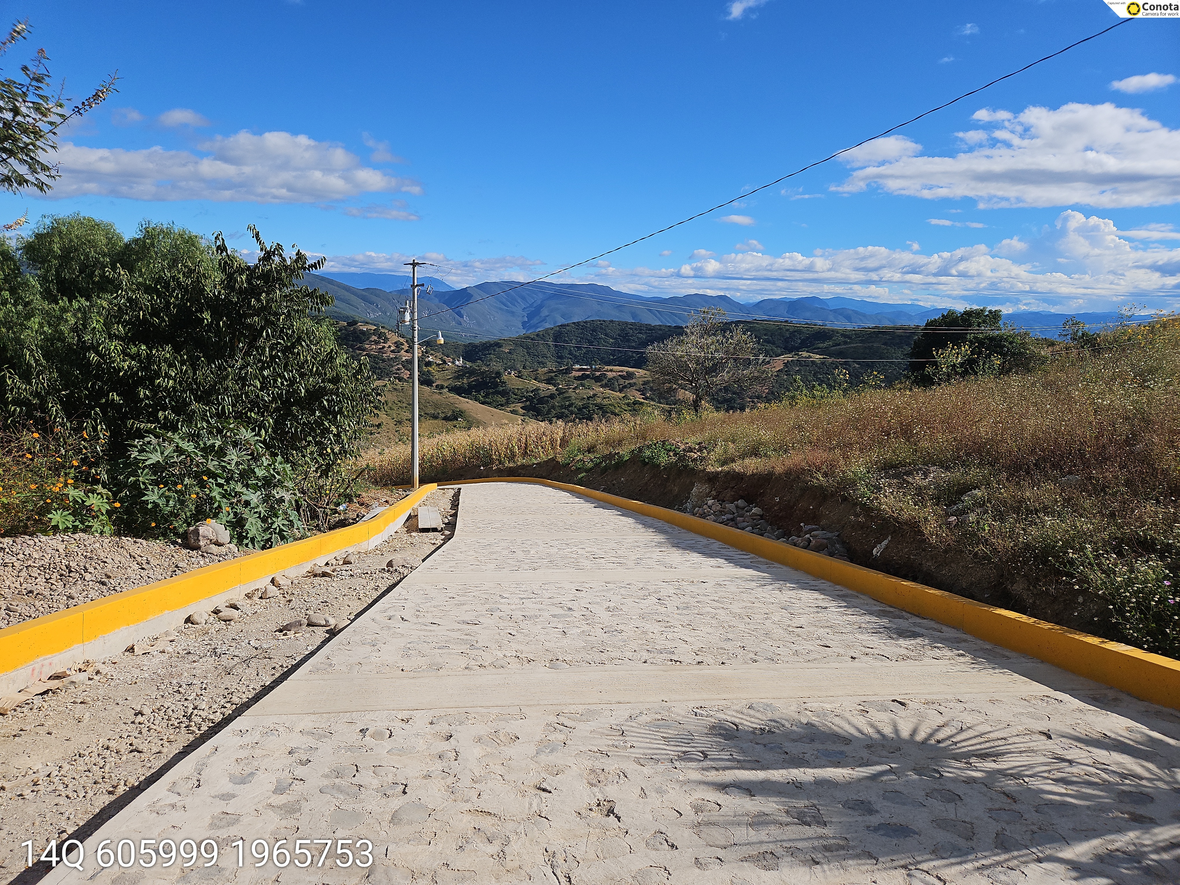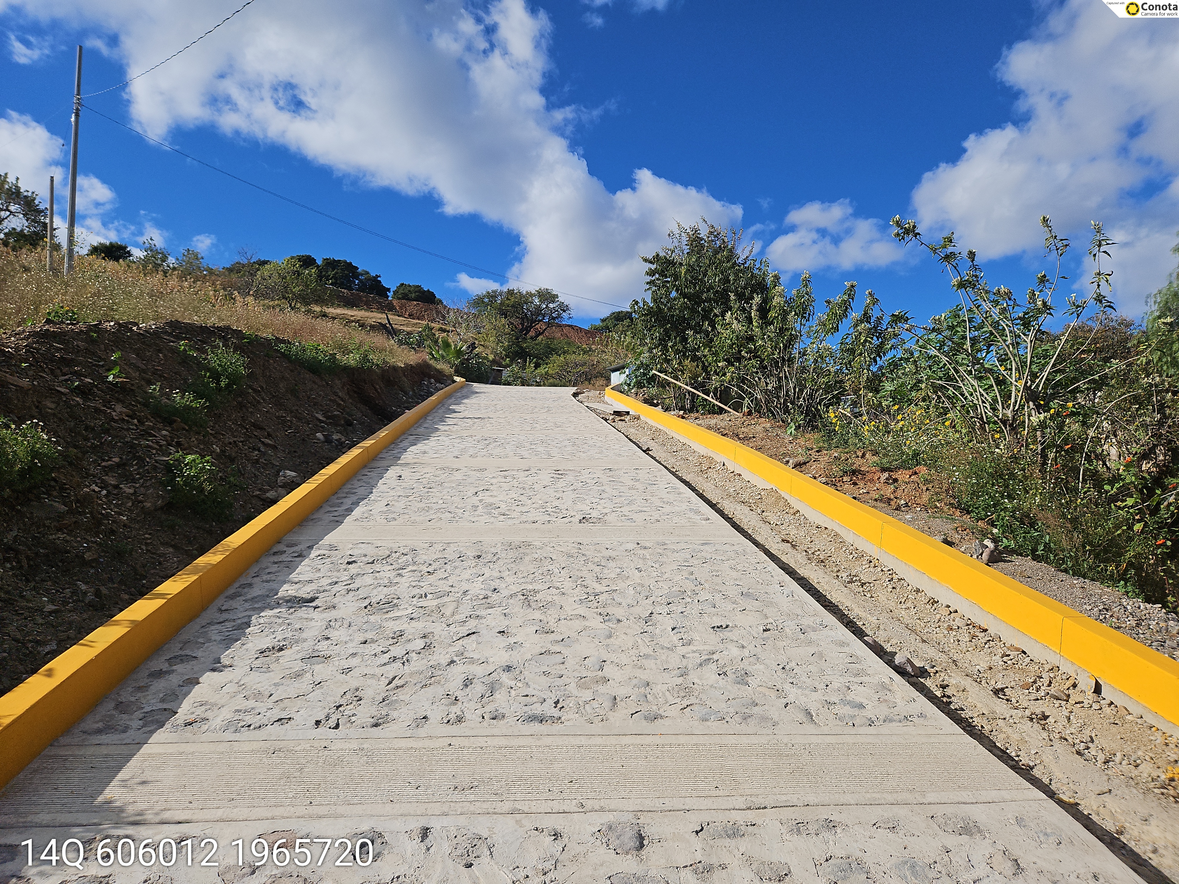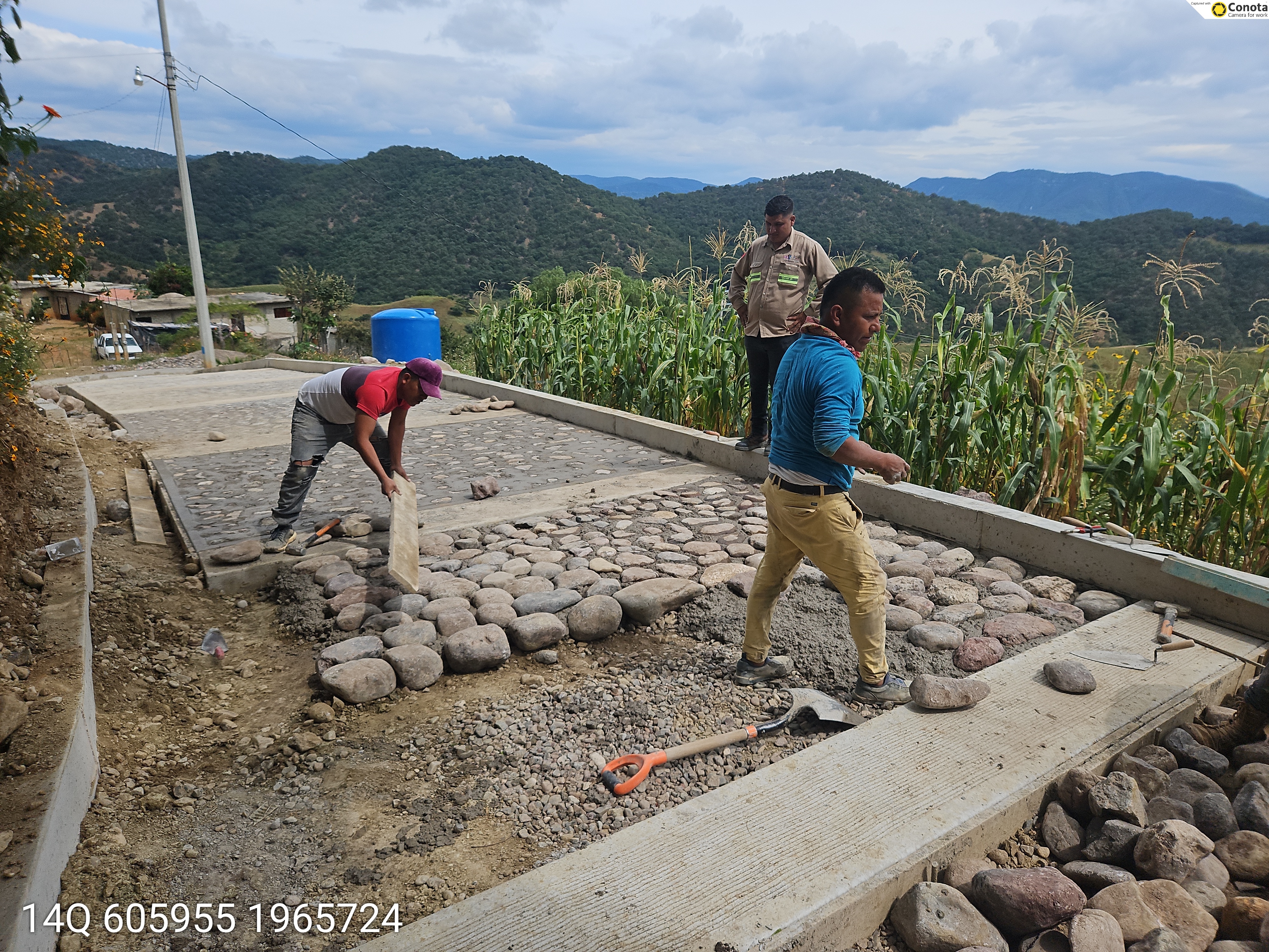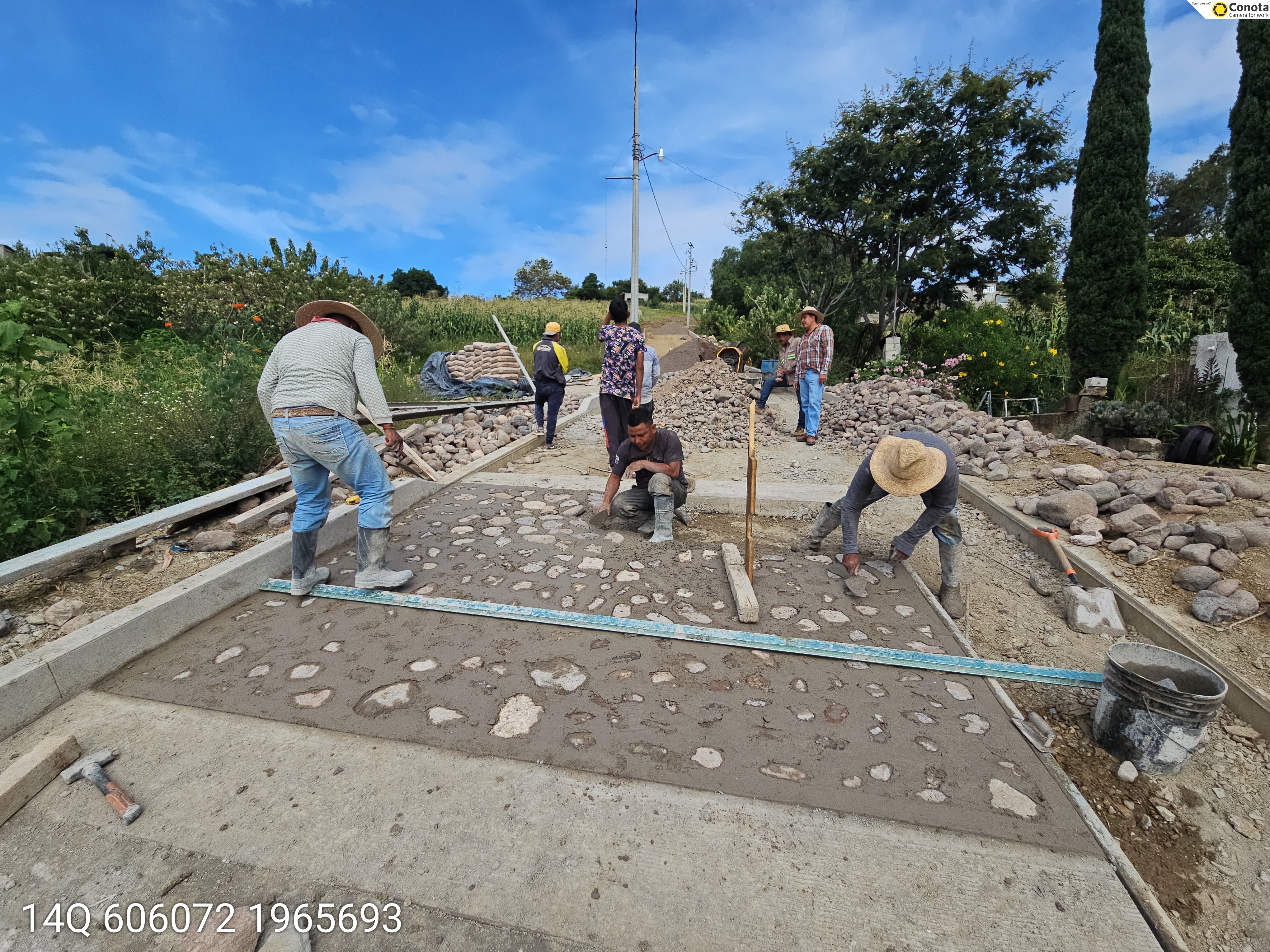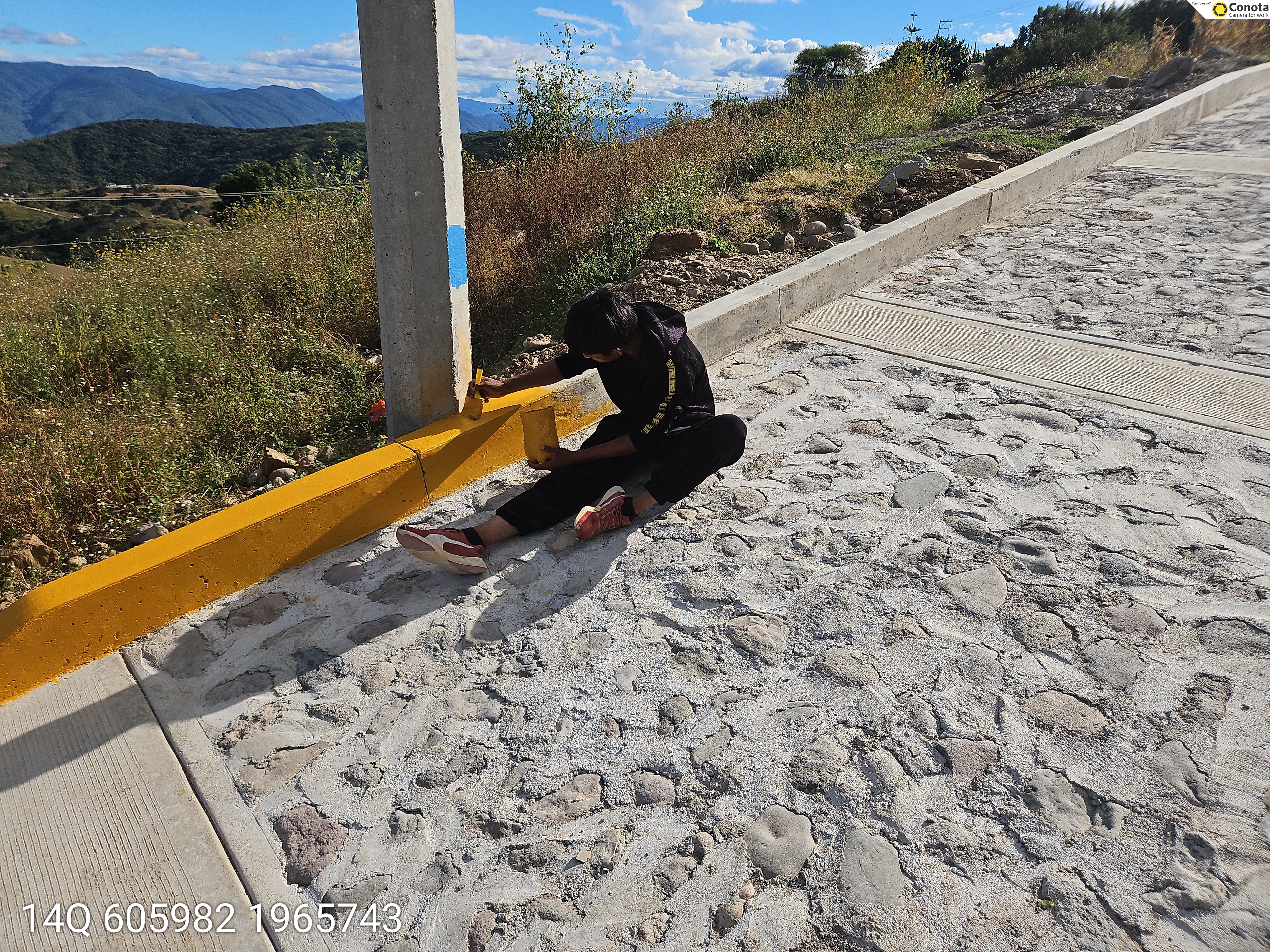TRAZO Y NIVELACIÓN MANUAL PARA ESTABLECER EJES, EXCAVACIÓN DE 33.75 M3 EN MATERIAL TIPO B EN CORTES EN TERRENO NATURAL PARA DESPALME DE TERRENO, CONSTRUCCIÓN DE 387.55 ML DE GUARNICIÓN DE 20X15X40 CM EN CONCRETO DE F´C=150 KG/CM2; CONSTRUCCIÓN DE 100.90 M2 DE PAVIMENTO DE CONCRETO HIDRÁULICO DE 15 CMS. DE ESPESOR CON CONCRETO F´C=200 KG/CM2 Y MALLA 6,6-10,10 PARA CINTURONES DE CONCRETO DE 0.50 M DE ANCHO A CADA 3.00 M Y CONSTRUCCIÓN 567.13 M2 DE EMPEDRADO A BASE DE PIEDRA BOLA DE RIO Y CONCRETO F´C=200KG/CM2 (60% PIEDRA 40% CONCRETO) ; SUMINISTRO Y APLICACIÓN DE 387.55 ML DE PINTURA DE COLOR AMARILLO TIPO TRAFICO PESADO DE BASE SOLVENTE EN GUARNICIONES; LIMPIEZA DE OBRA Y SUMINISTRO Y COLOCACIÓN DE LETRERO INFORMATIVO DE OBRA DE 1.20M X 0.90M A BASE DE PERFIL METÁLICO DE TUBULAR 2X2 Y LAMINA METÁLICA CON VINIL.