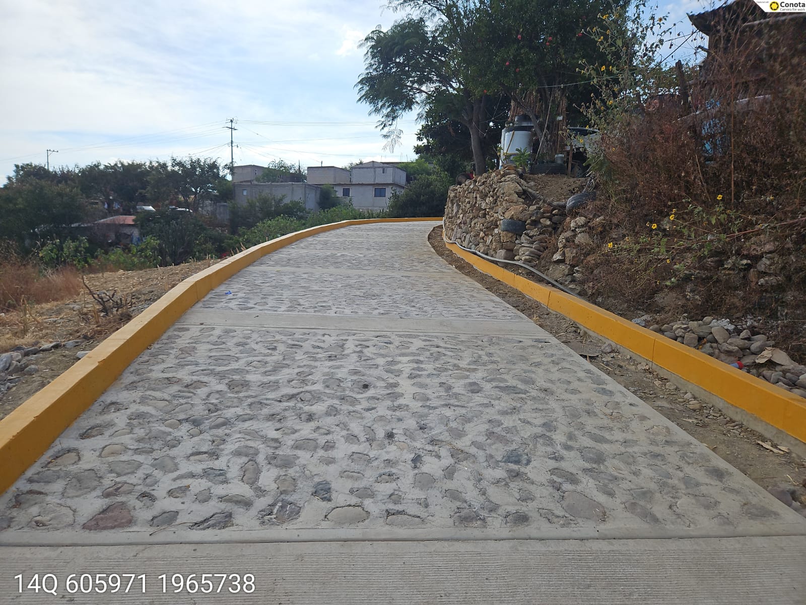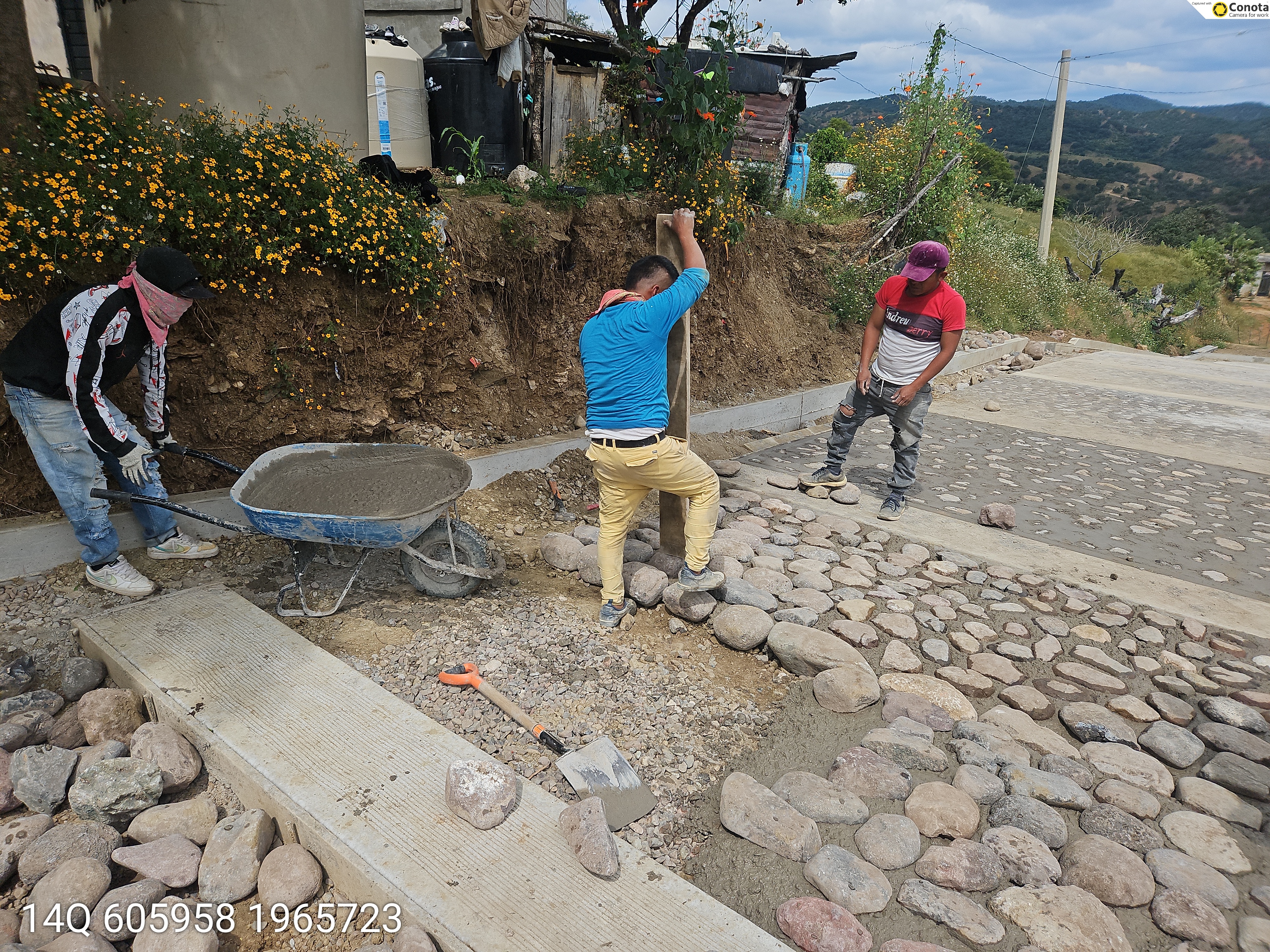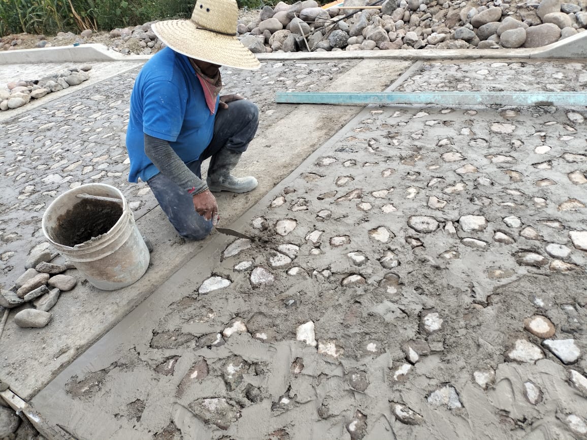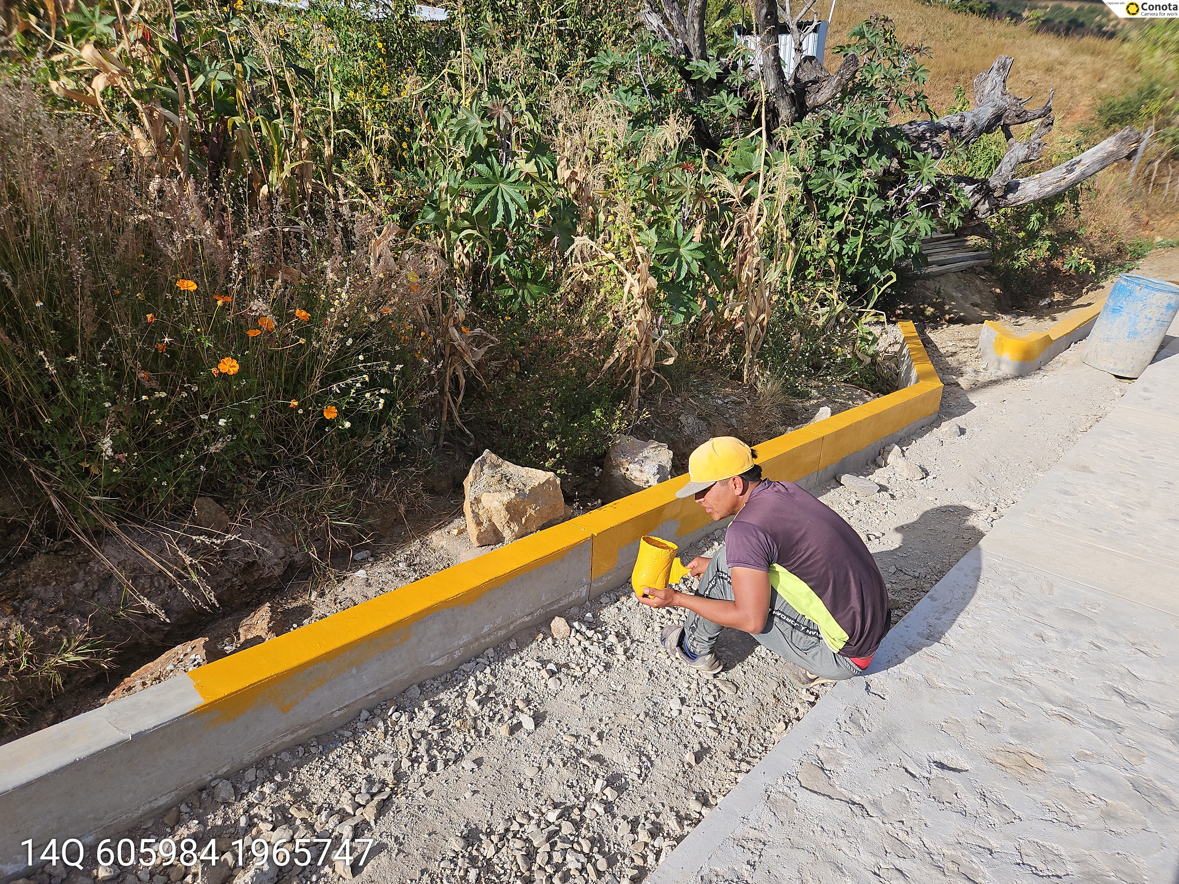 TRAZO Y NIVELACIÓN MANUAL PARA ESTABLECER EJES, EXCAVACIÓN DE 33.75 M3 EN MATERIAL TIPO B EN CORTES EN TERRENO NATURAL PARA DESPALME DE TERRENO, CONSTRUCCIÓN DE 387.55 ML DE GUARNICIÓN DE 20X15X40 CM EN CONCRETO DE F´C=150 KG/CM2; CONSTRUCCIÓN DE 100.90 M2 DE PAVIMENTO DE CONCRETO HIDRÁULICO DE 15 CMS. DE ESPESOR CON CONCRETO F´C=200 KG/CM2 Y MALLA 6,6-10,10 PARA CINTURONES DE CONCRETO DE 0.50 M DE ANCHO A CADA 3.00 M Y CONSTRUCCIÓN 567.13 M2 DE EMPEDRADO A BASE DE PIEDRA BOLA DE RIO Y CONCRETO F´C=200KG/CM2 (60% PIEDRA 40% CONCRETO) ; SUMINISTRO Y APLICACIÓN DE 387.55 ML DE PINTURA DE COLOR AMARILLO TIPO TRAFICO PESADO DE BASE SOLVENTE EN GUARNICIONES; LIMPIEZA DE OBRA Y SUMINISTRO Y COLOCACIÓN DE LETRERO INFORMATIVO DE OBRA DE 1.20M X 0.90M A BASE DE PERFIL METÁLICO DE TUBULAR 2X2 Y LAMINA METÁLICA CON VINIL.